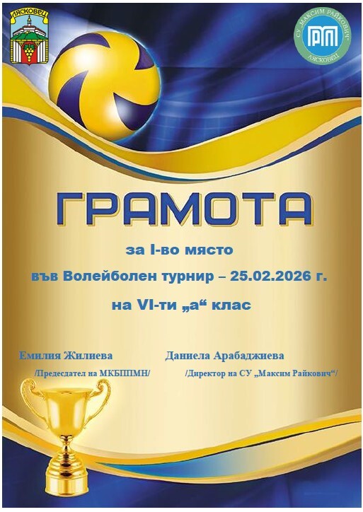 Волейболният турнир тази година протече в I-ви корпус на СУ „Максим Райкович“, под зоркото съдийско око на учителите по физическо възпитание Станислав Георгиев и Димитър Димитров. В рамките на турнира децата показаха спортните си умения, които за възрастта им възхитиха секретарят на комисията Цветомила Берова, която наблюдава оспорваните геймове. Учениците от V-тите и VI-тите класове играха в смесени отбори от момичета и момчета в три последователни мача с общо четиринадесет гейма. В края на турнира секретарят връчи грамоти от името на председателя на местната комисия и директора на СУ „Максим Райкович“ на класиралите се на I-во, II-ро и III-то място отбори. Трето място спечели отборът на 5-ти „а“ клас, на II-ро място останаха 6-ти „б“ клас, а призовата грамота след оспорван финален мач, бе връчена на 6-ти „а“ клас.
