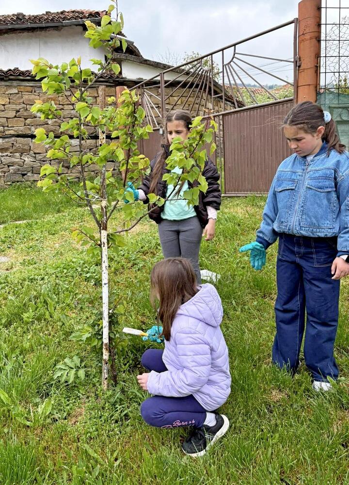 Малките еколози като достойни природозащитници не пропуснаха да се погрижат и за дворното пространство. Те изработиха къщички за птици, засадиха дръвчета и цветя и варосаха дърветата в училищните зелени площи.