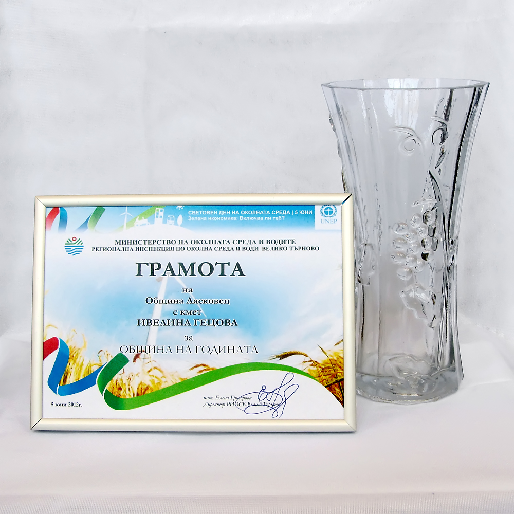 Община Лясковец бе избрана за „Oбщина на годината” 2012 от Регионалната инспекция по околна среда и води във Велико Търново. Отличието й бе връчено по повод Световния ден на околната среда - 5 юни, на специална церемония, на която по традиция РИОСВ дава награди за принос в опазването на околната среда на кметове и еколози на общини, фирми, медии и институции от Великотърновска и Габровска области. Грамотите и приза бяха връчени на зам. кмета на общината ни Георги Петров от главния секретар на екоминистерството Климентина Денева, която гостуваше на търновската инспекция и от директора на РИОСВ инж. Елена Григорова.