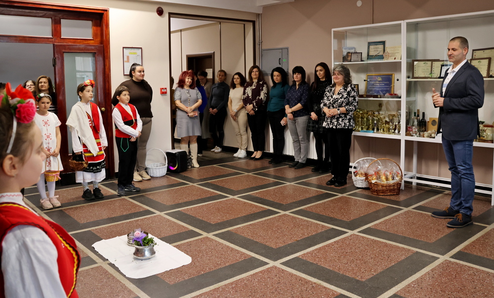 Децата, които посетиха предпразнично кмета и екипа му, бяха възпитаници на СУ „Максим Райкович“. Учениците бяха от третите класове на гимназията, ръководени от учителите Стефка Обрешкова и Николета Петрова. Те изпълниха много богата програма с песни, хора, наричания и типични за празника ритуални действия. Наричайки на кмета Васил Христов като стопанин на дома, те отправиха своите послания за здраве, берекет и благополучие на цялата община.