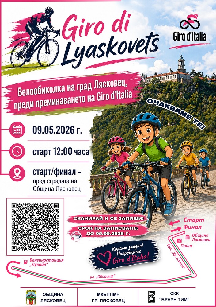 Стартът и финалът на детската спортна инициатива ще бъдат пред сградата на Община Лясковец. Велообиколката е с начален час 12:00 ч. като за целта също се налага временна организация на движението. Маршрутът, по който деца и младежи ще се движат на велосипеди е от сградата на Общината, пл. „Възраждане“, покрай Пощенска станция, по бул. „Хр. Ботев“ / и в двете платна/ и по ул. „Оборище“ до Бензиностанция „Лукойл“ и обратно.